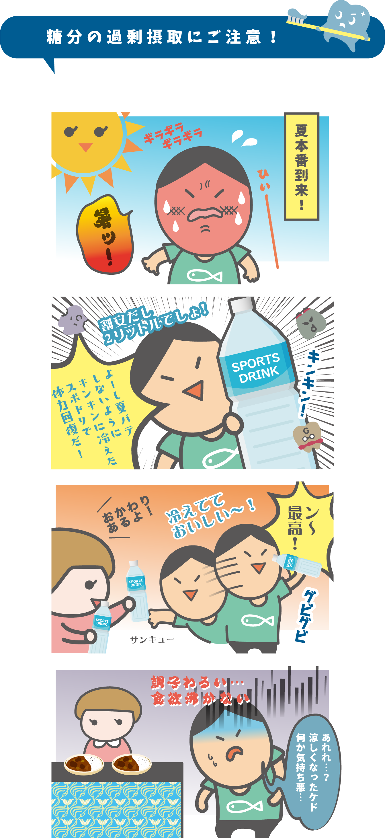 ソフトドリンクやスポーツドリンクの急激な大量摂取だけでなく、炭酸飲料、スイーツ(アイスクリーム、スムージー)など、糖分の多い食品の大量摂食でも発症することが報告されています。